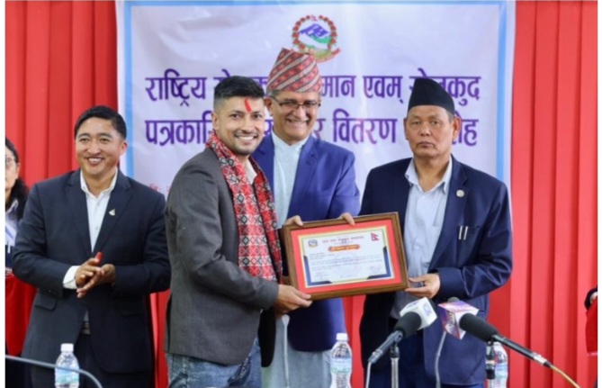 सोमवार राजधानीमा आयोजित विशेष समारोहका बिच खेलकुदमन्त्री तेजुलाल चौधरीले ७ प्रदेशबाट १/१ जना,१ जना समावेशी,१ जना दलित तथा १ जना केन्द्रका अनुभवी पत्रकार गरि १० जनालाई नगद राशिले सम्मान गरेका हुन्।